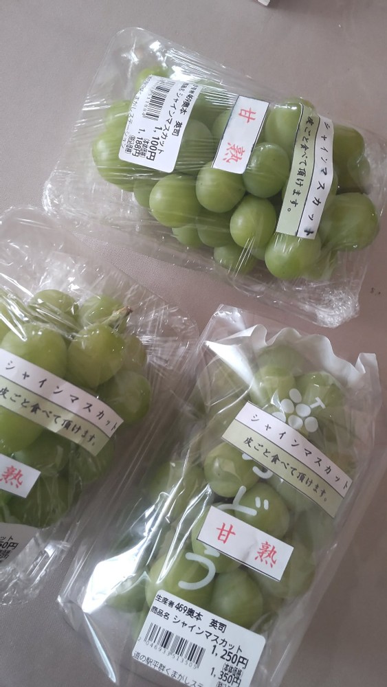 Right now, it's Shine Muscat (a kind of grapes) season, so we bought three packs. I believe that Shine Muscat is the king of grapes because of its sweetness. They are seedless, and their skins are very soft and edible. That's why they are very popular in Japan, but unfortunately, they are quite expensive. I'm glad that we can get them a bit cheaper at some farmer's markets.