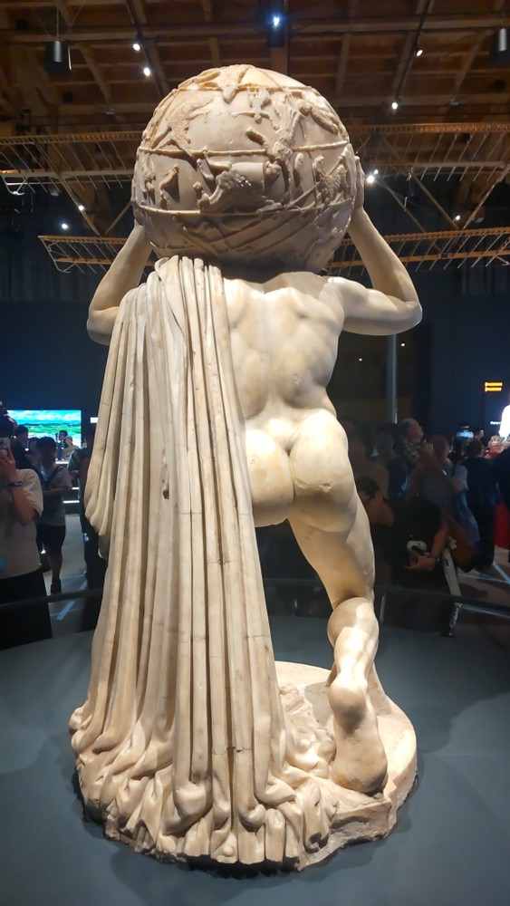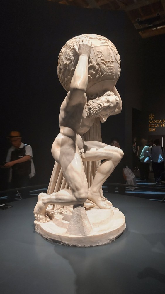 After enjoying the bike race, we finally entered the inside. The first piece we saw was the Farnese Atlas, created around 150 AD. The Celestial sphere carried by Atlas became the model for the first celestial globe in the 16C. I was so impressed. It was its first exhibition in Asia. The details of muscles and draping the cape was absolutely breathtaking. Even though, it was a statue, it felt like he was carrying the very heavy thing.