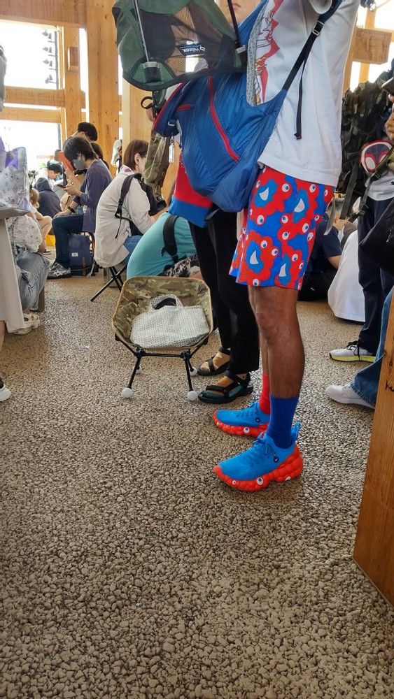 I spotted a guy wearing shots printed with the Expo mascot, Myakumyaku, and a pair of shoes looked like the mascot. He was even wearing the mascot colors, red and blue socks.