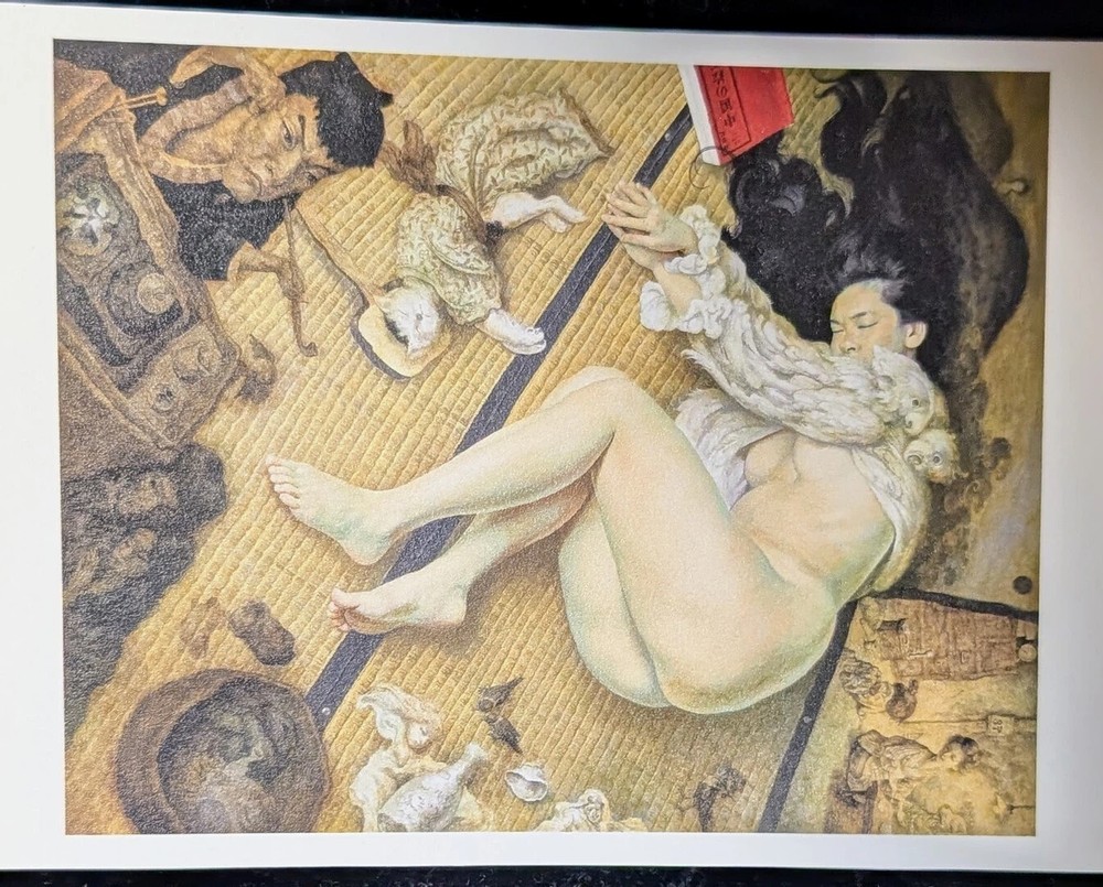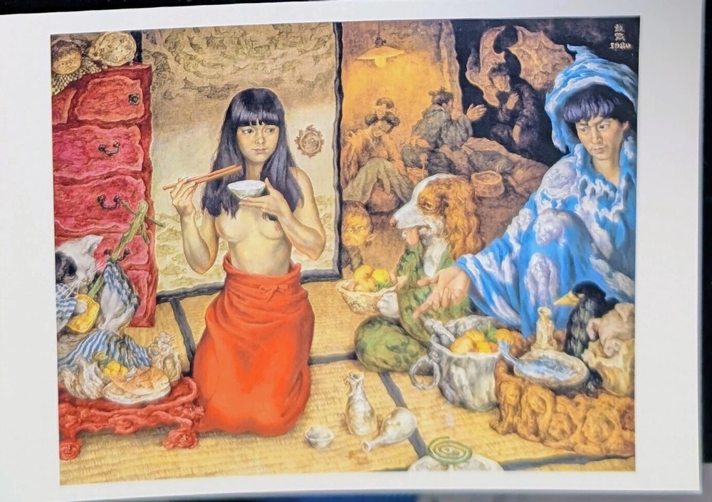 The woman holding a teacup is his wife, Shiho. She often modeled for him. This is one of my favorite his pieces. I think he's really good at blending unrealistic elements such as a dog customer sitting in a chair, creepy looking human faces on each chair, human faces hidden on a red jacket, a frog had, a snail hat and more. It's fun to find these little hidden things.
