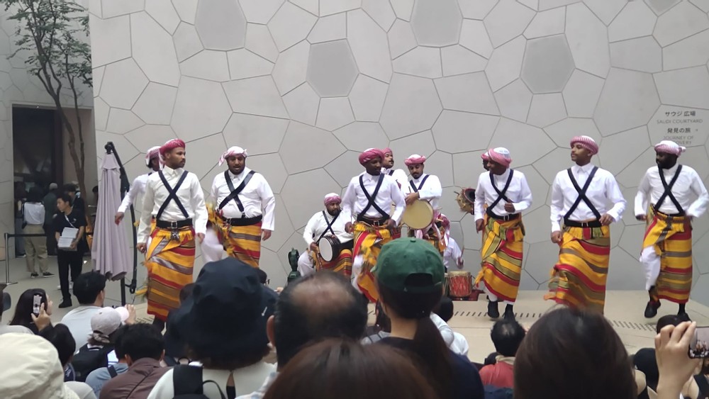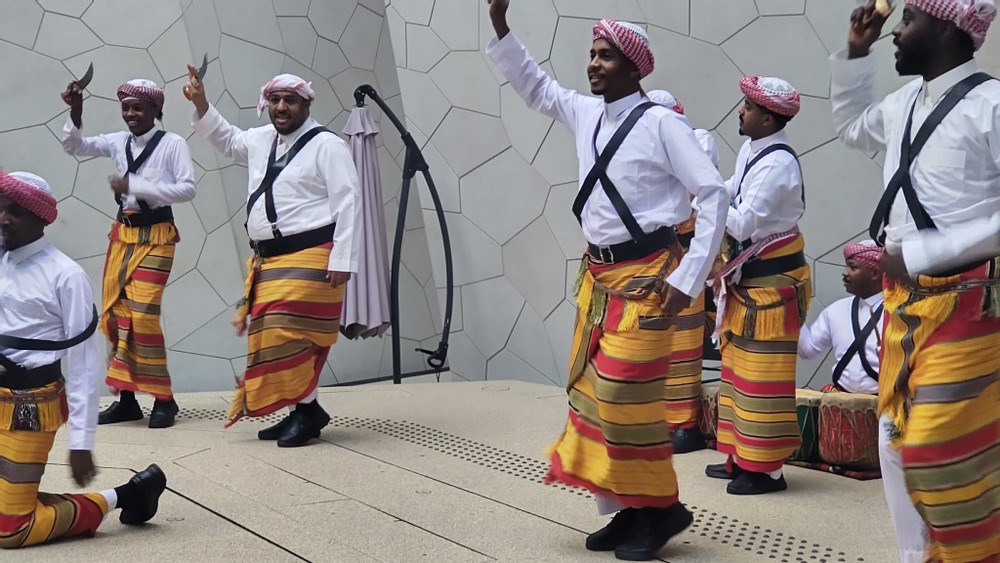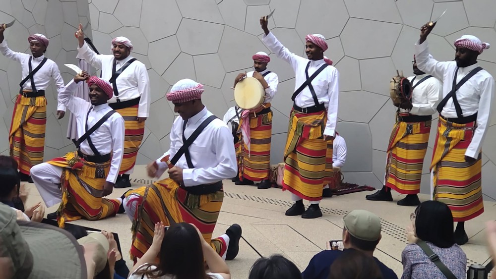 A group of people from Saudi Arabia were performing a traditional dance in front of the entrance. They were holding knives and looked very powerful.