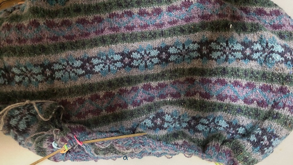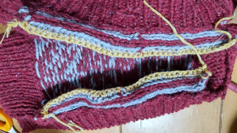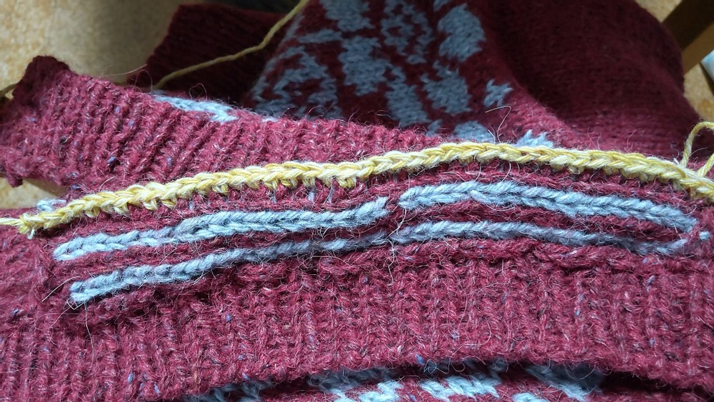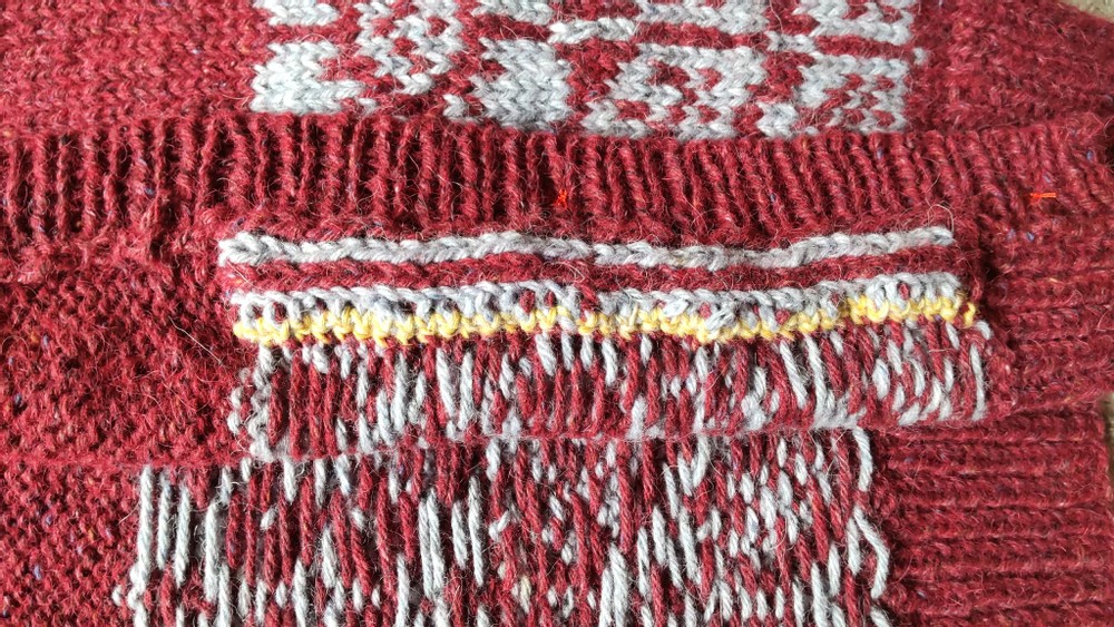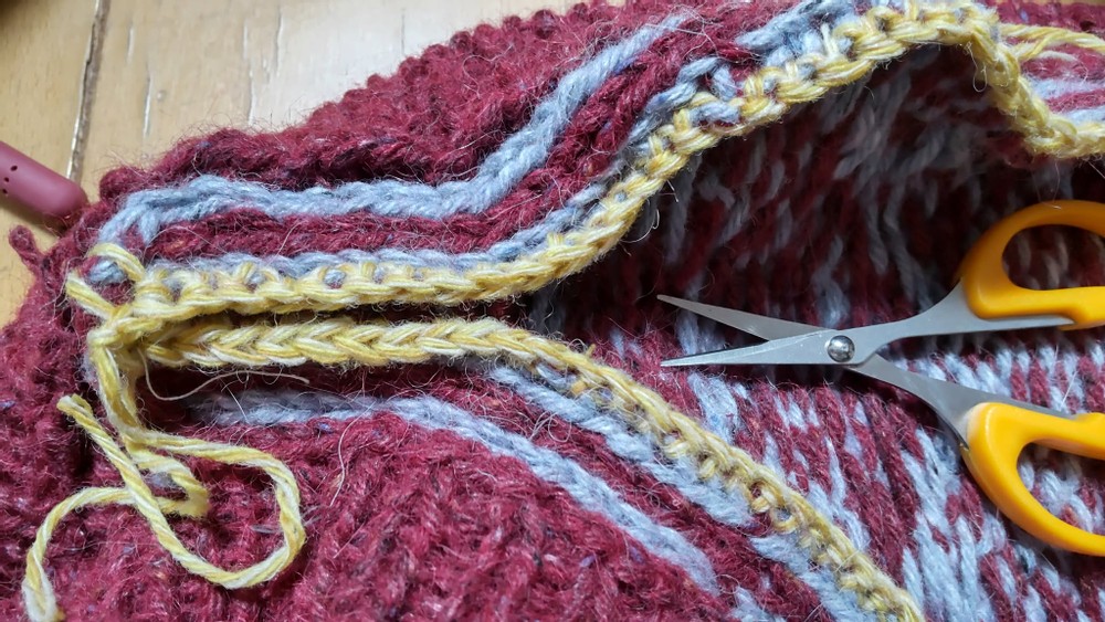 One special technique I needed was steeking. I've knitted several Fair Isle garments before with the proper yarn for the technique, so I'd done steeking in the past. However, this was my first time using much thicker yarn, so I was nervous about cutting it .