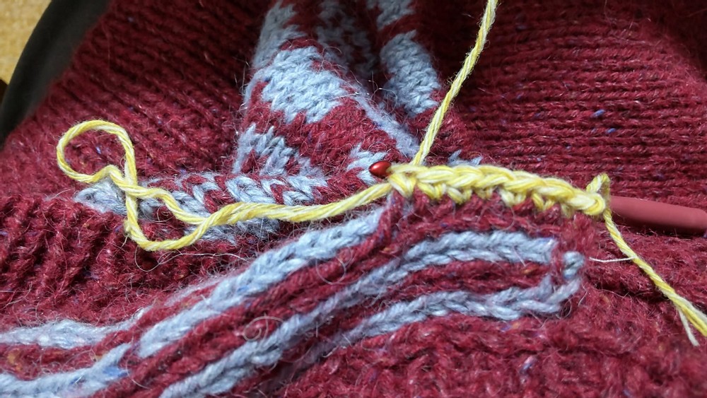 First, I reinforced the area by crocheting along the cutting line with yellow yarn. This helps prevent the fabric from unraveling.