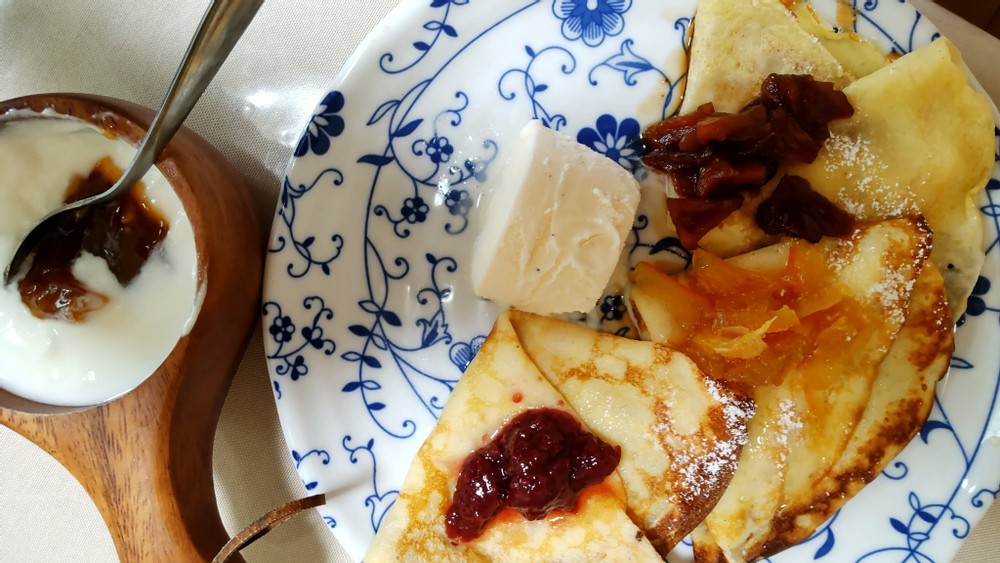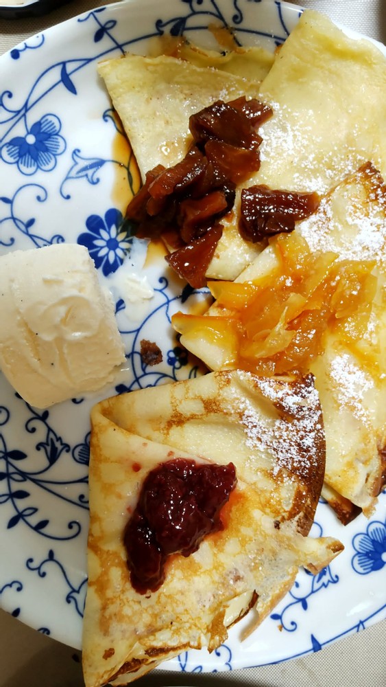 That day, I wanted a small change and made some crepes. I added my homemade apple feeling, marmalade, and some store- bought raspberry jam. I also added vanilla ice cream. I sometimes enjoy making these small changes to brighten my days.