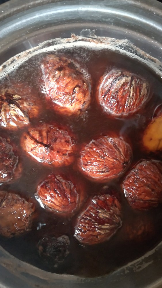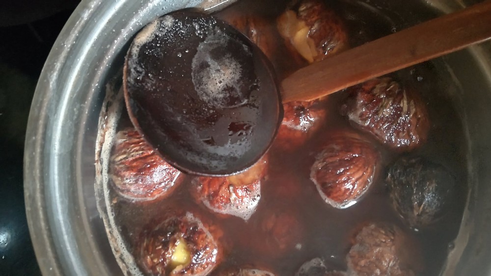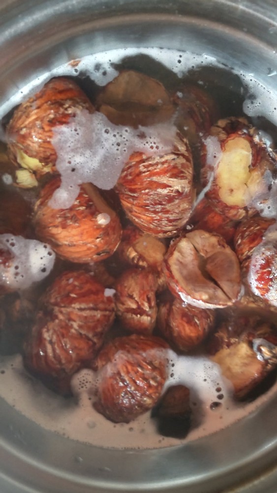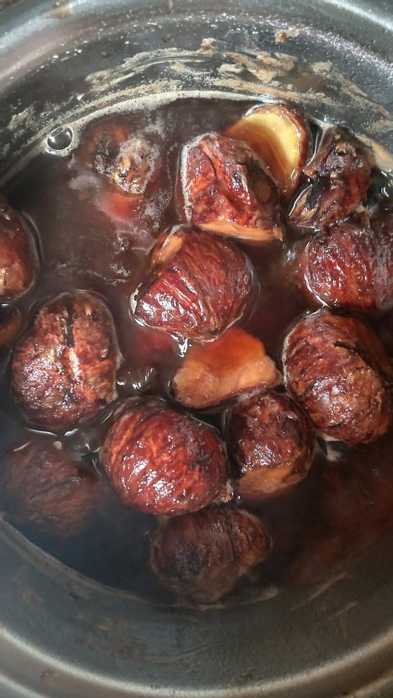 Then, I added brown sugar equal to 50% of the total weight of the chestnuts and simmered them for a while.