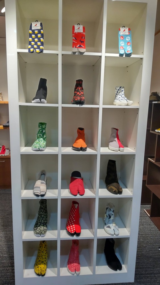 Surprisingly, there were so many tabi-style shoes. Tabi are Japanese traditional toe-split socks worn with kimonos. It was my first time seeing shoes in that style. My friend bought a few pairs of tabi socks. According to her, they help strengthen the muscles in the soles of your feet and improve posture and balance. I'm not interested in wearing white tabi, but wearing those colorful ones must be fun!