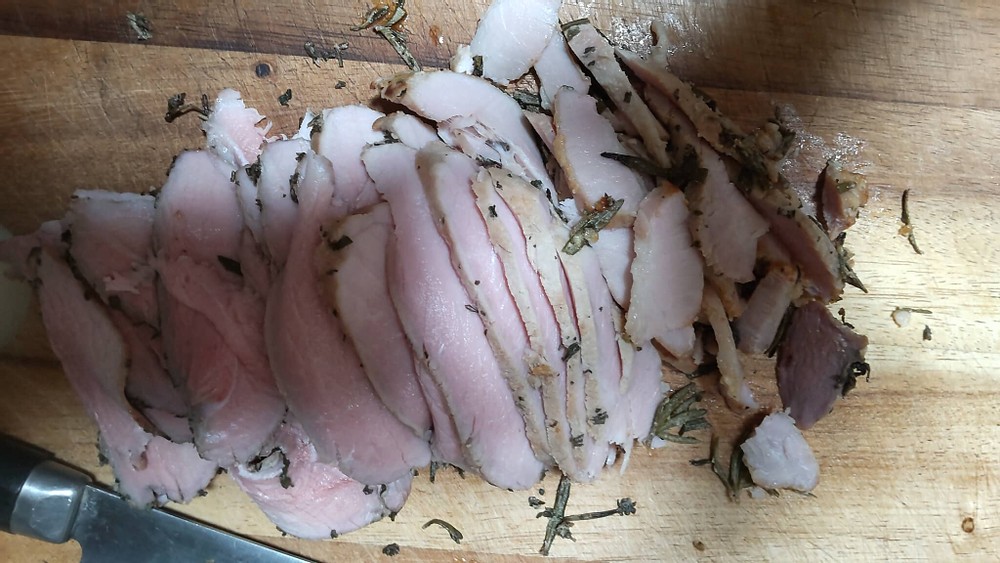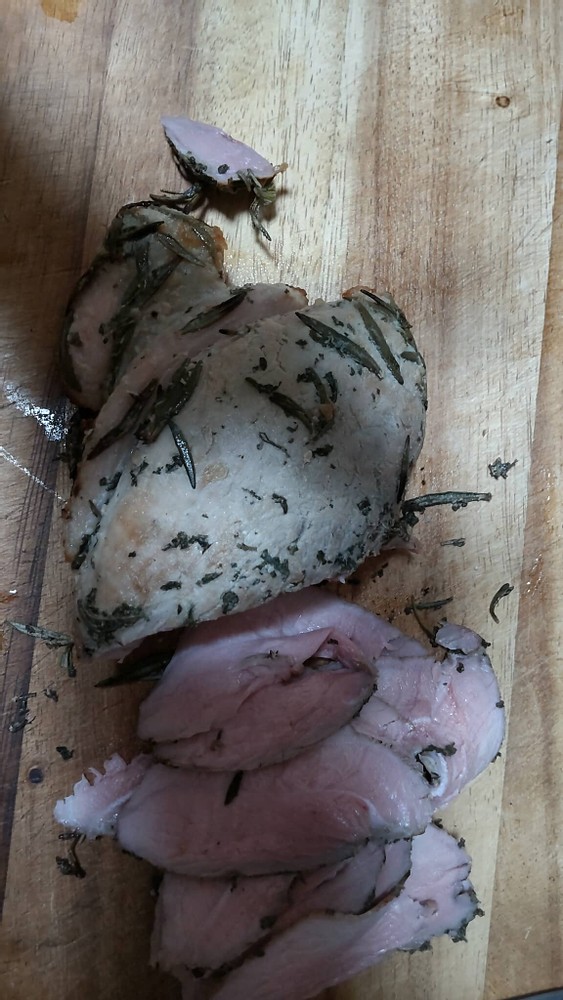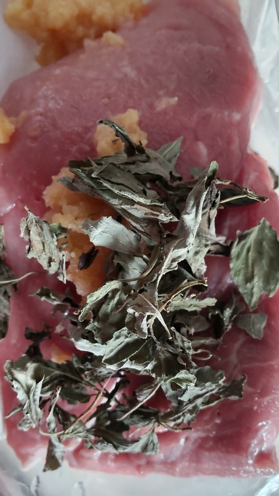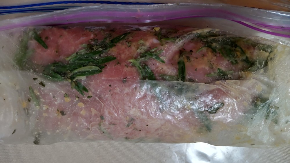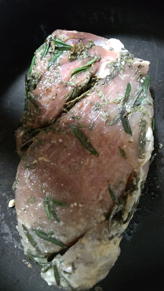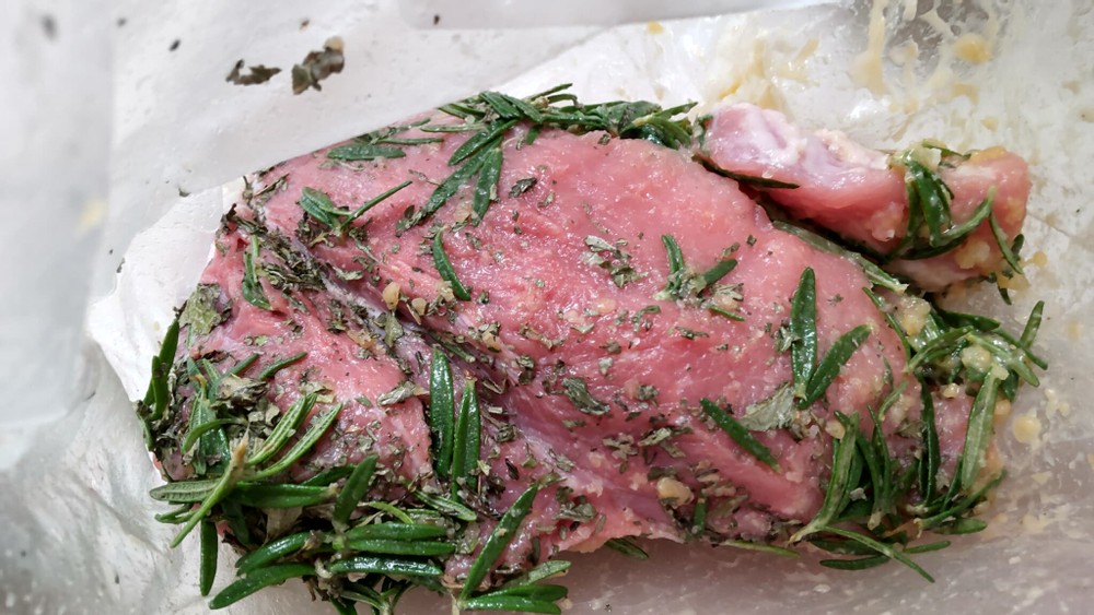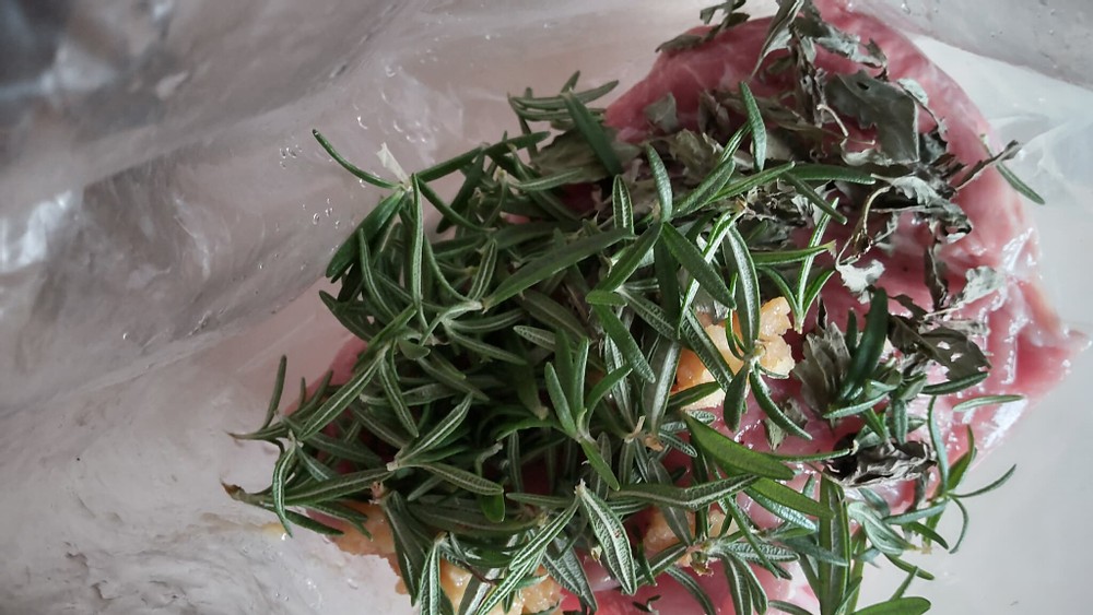 I mix the homemade fermented garlic, oregano, rosemary and the pork block together and place them into a Ziplock bag. Then, leave it in a refrigerator to let it marinate for two days.