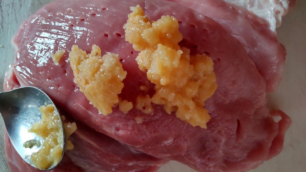 The picture below shows my homemade fermented garlic. When you use it on beef or pork before cooking, the meats become softer and lightly salted, and the garlic aroma helps meats odor reduce .
