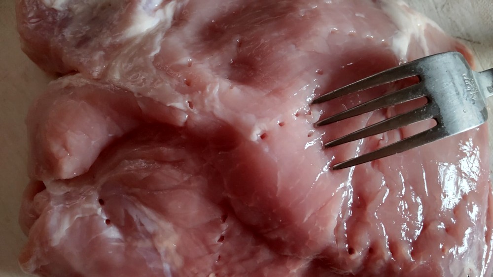 To cook the pork, I place the pork on a frying pan and brown its both surfaces.