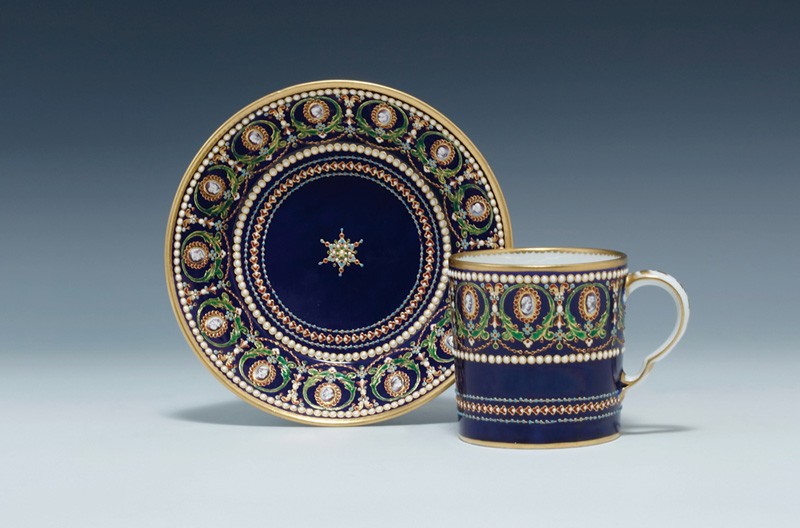 A cameo cup and saucer made in 1784. The deep blue was famous and known as Royal Blue.