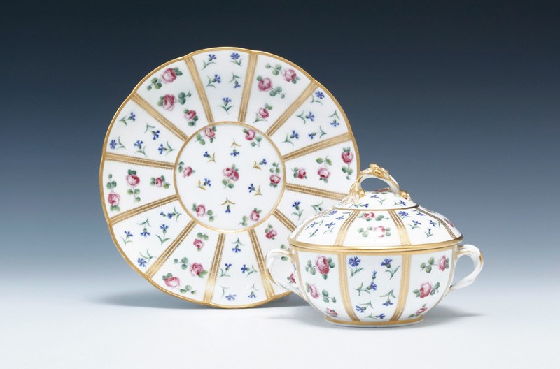 Last month, I attended a porcelain exhibit from France with a friend of mine. I started porcelain painting in an European style called the Nyon Kiln, so I was really looking forward to seeing pieces from the Sevres Kiln. The Sevres Kiln started in France, 1738, while the Nyon Kiln started in 1781, Switzerland. Both styles look similar, but the Sevres Kiln was supported by Louis XV , his royal mistress, Madame de Pompadour and, Marie Antoinette, so eventually it was getting more glamorous. They all contributed to the Rococo style, and the porcelain during the period look very elegant.