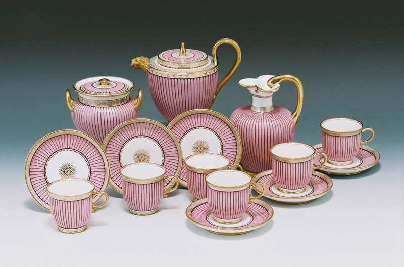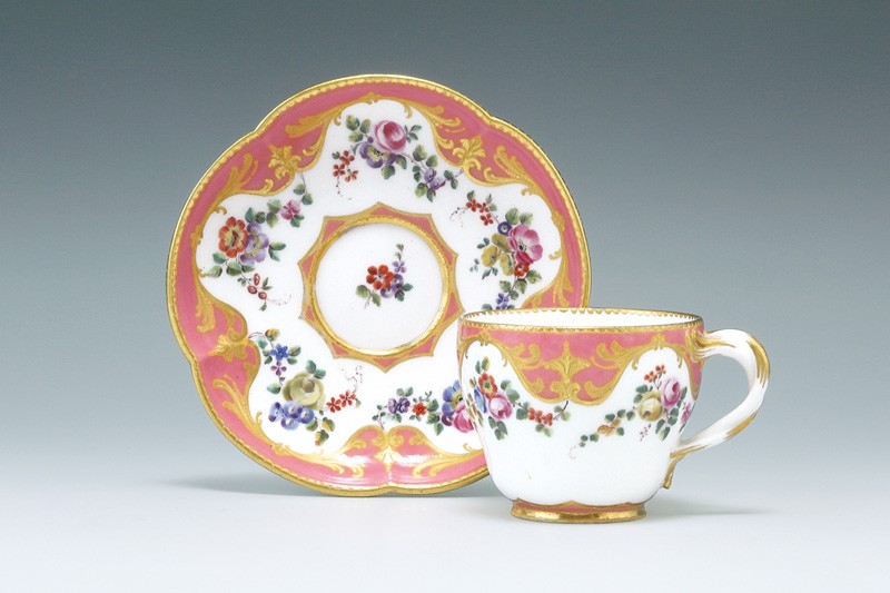 A cup and saucer made in 1761. That pink was Madame de Pompadour's favorite color and known as Pompadour Pink.
