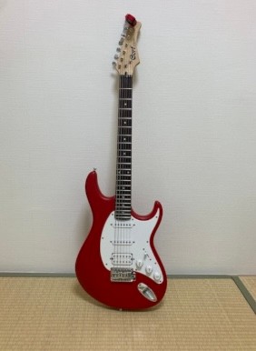 I've known this red guitar for about three months. I take guitar lessons at a studio in a guitar repair shop and usually chat with the master of the shop while waiting [no preposition] my turn. When I told him I was interested in electric guitars, he recommended this used one. I tried it out then, but we were by the lesson studio, so I couldn't hear it amplified. To be honest, the guitar was so cheap — he said it was only 20K JPY (approximately 128 USD) — that I didn't think it was a good guitar, but I remember it was light and comfortable to play.