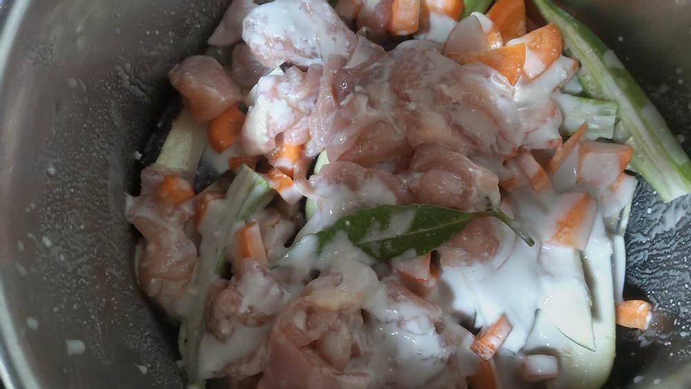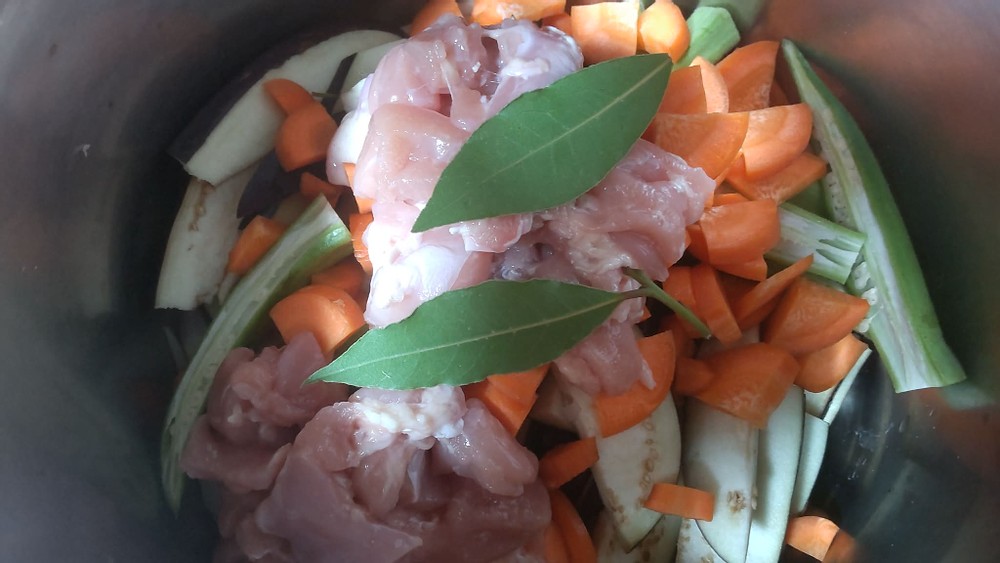 I placed all the vegetables and chicken into a pot and added two fresh bay leaves from my garden.