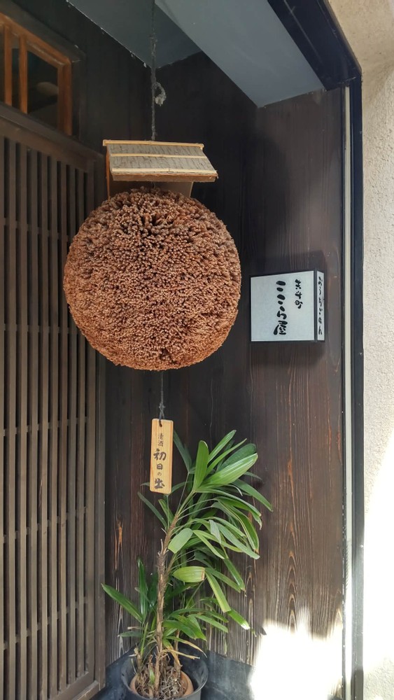 The big brown ball-like object is called a "sugidama" in Japanese, which is a sign for a sake brewery and is hung at the entrance. The shop in the picture looked like a bar where you can drink sake.