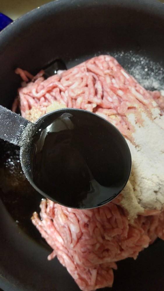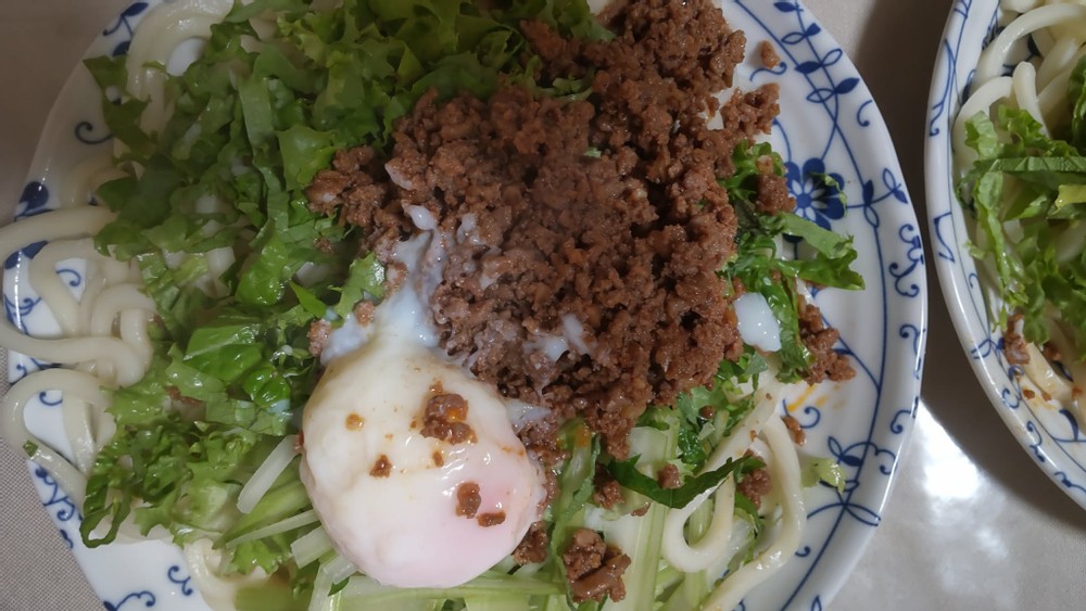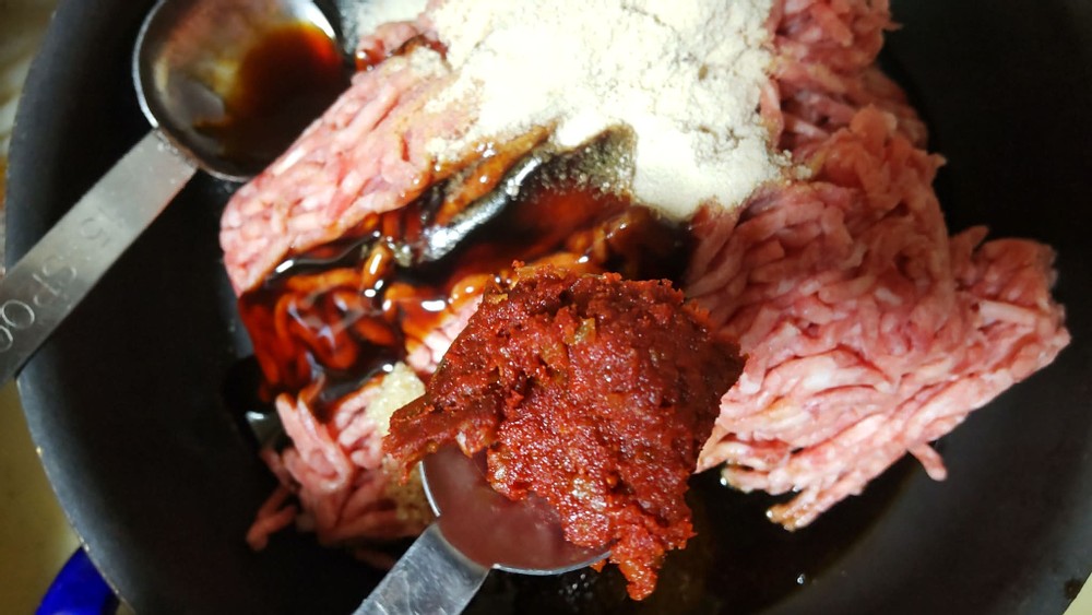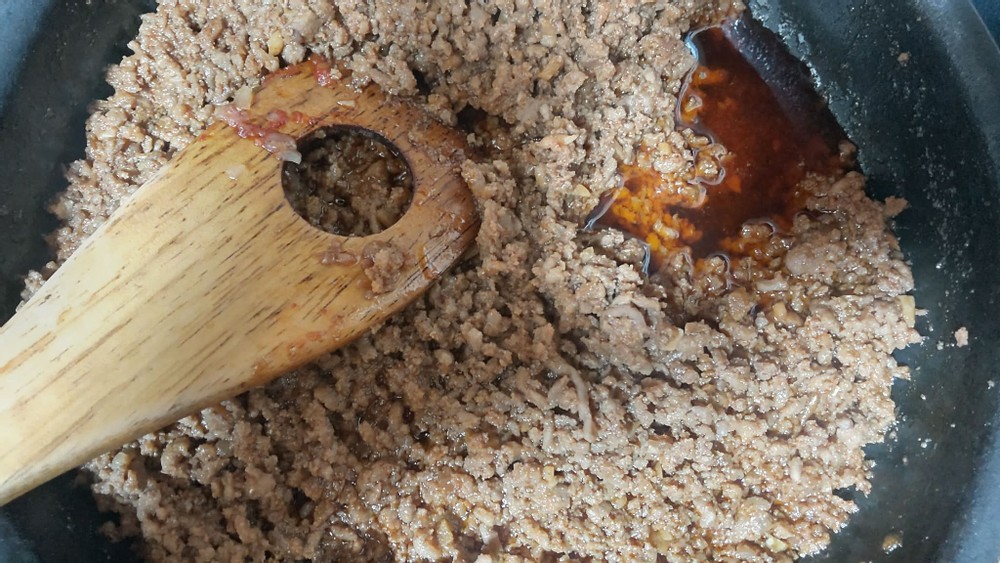 First, I made up my mind to make 肉味噌 (niku miso) using my homemade doubanjiang. Niku miso is made with miso, doubanjiang, minced meat, sugar, garlic, ginger, oyster sauce, and Chinese soup stock. I like eating udon (a kind of Japanese noodle) with it.