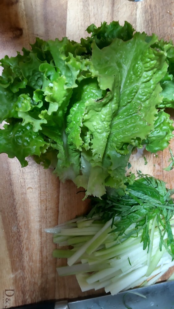 I prepared my homegrown fresh lettuce, celery, and sisho ( a type of Japanese herb) as topping for the udon.