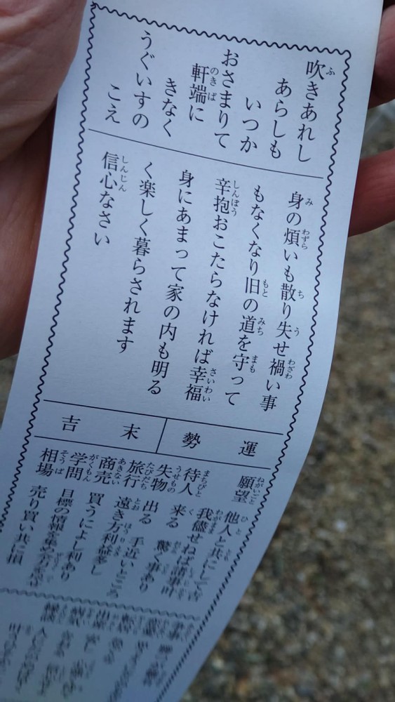 Before playing, we drew おみくじ ( fortune slip). My mom drew the best fortune and the Shinto staff congratulated her. She seemed to be very happy. Mine in the picture below was the lower fortune, but even so it was still a fortune, so I'm satisfied with it.