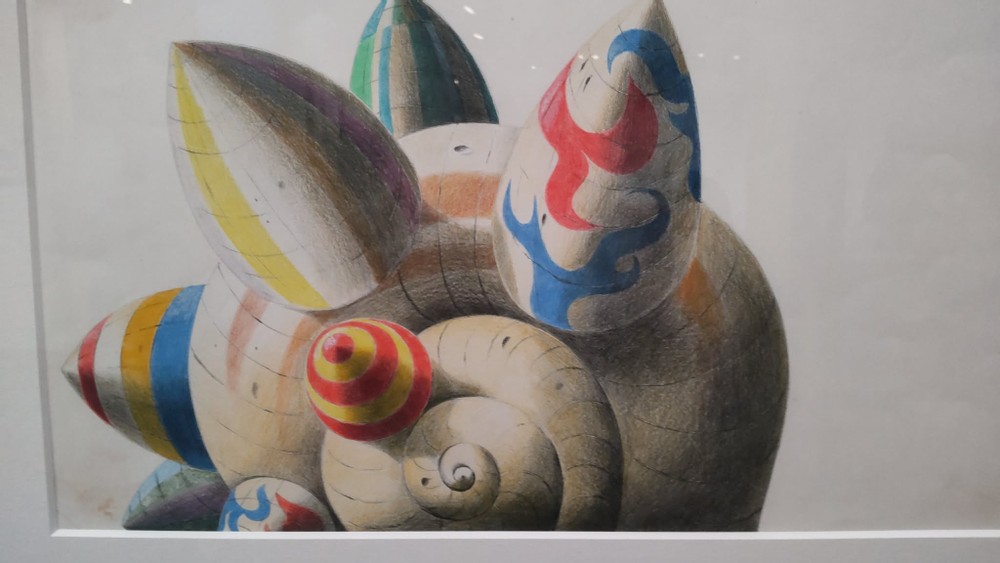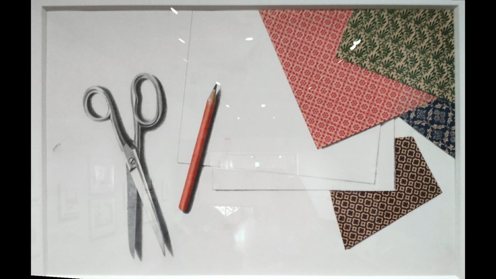I was also impressed by his remarkable techniques. Both the scissors and the pencil are his drawings, while some origami elements are real.