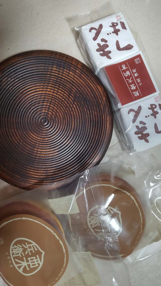 I bought these in the picture below there: two different kinds of Japanese sweets and a wooden stand for my flower vase.