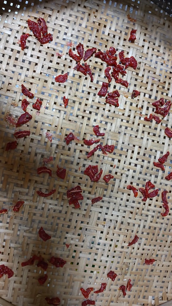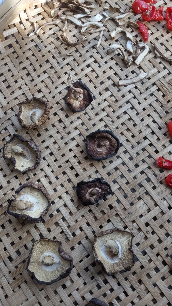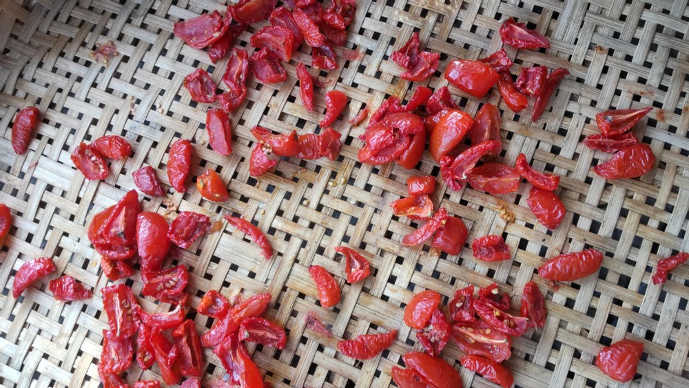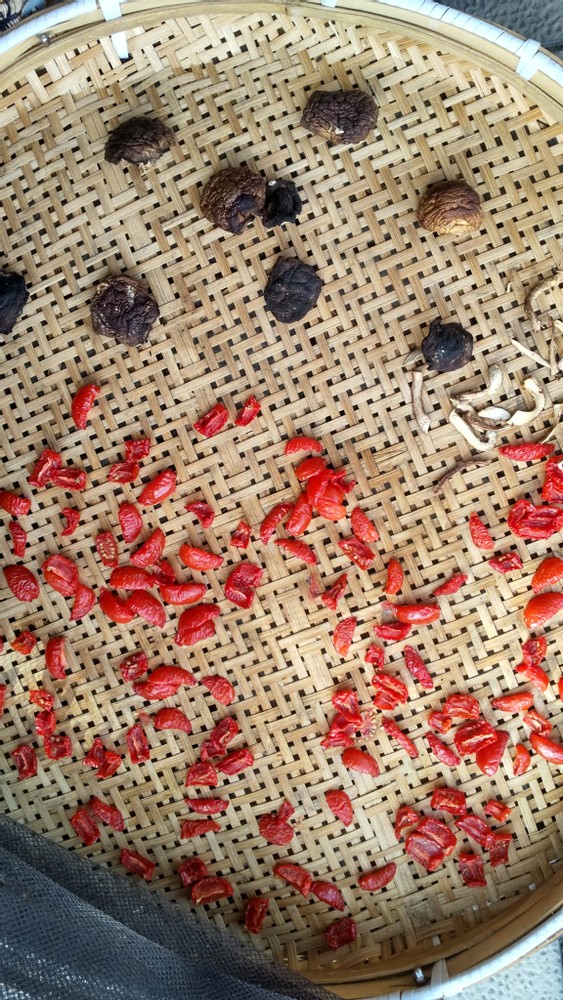 Winter in Japan is very dry, so I often take advantage of the weather to make dried food. I especially enjoy making dried mushrooms and dried tomatoes. Making those is quite simple. I just slice them and dry, and that's it. It takes a couple of days for them to completely dry.