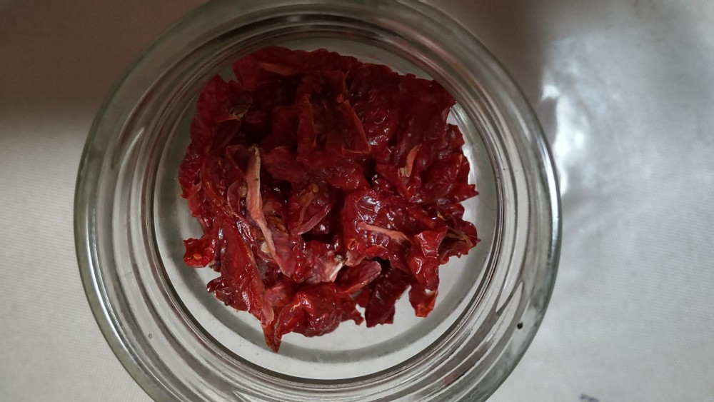 Once they're fully dried, I gather them into a small jar and cover them with olive oil. I haven't added any herbs yet, but I'm going to add my homemade dried oregano, dried rosemary, and fresh bay leaves from my garden. They'll become great ingredients for pasta.