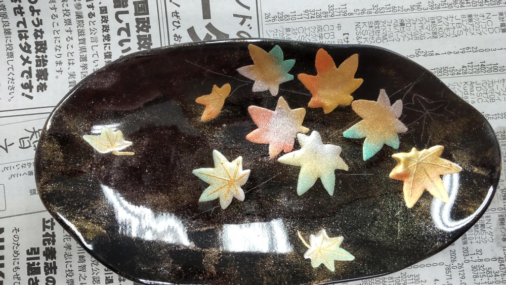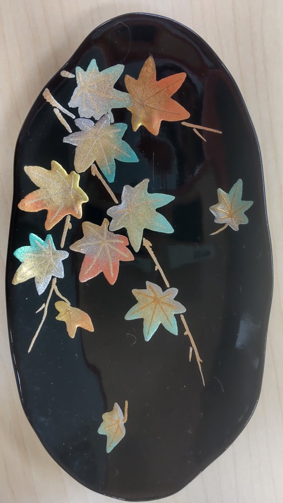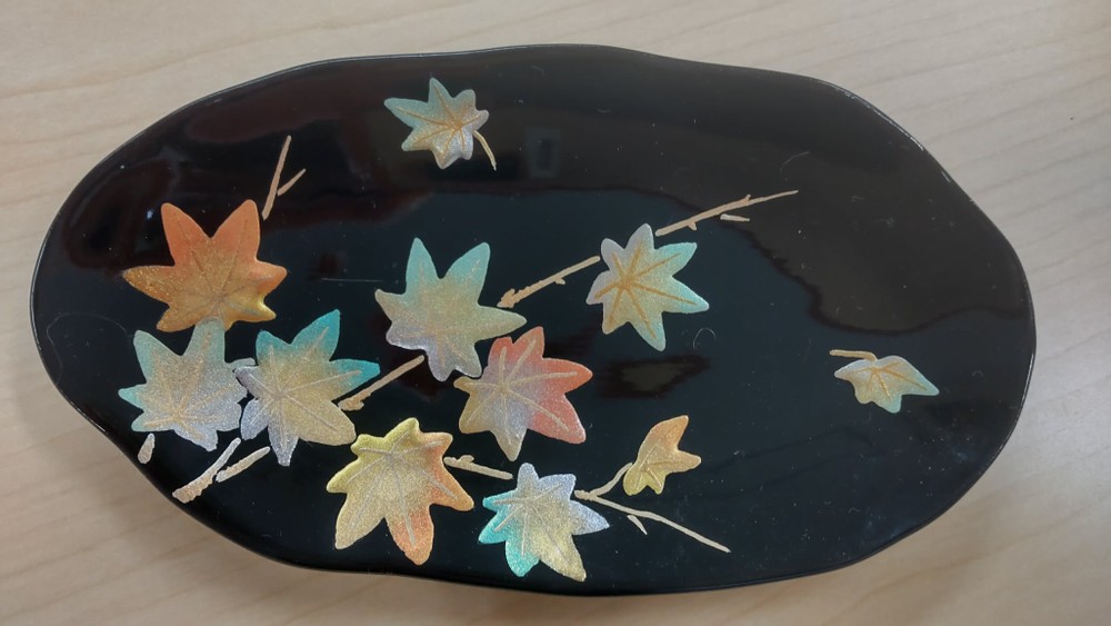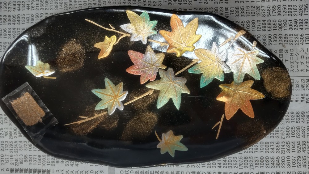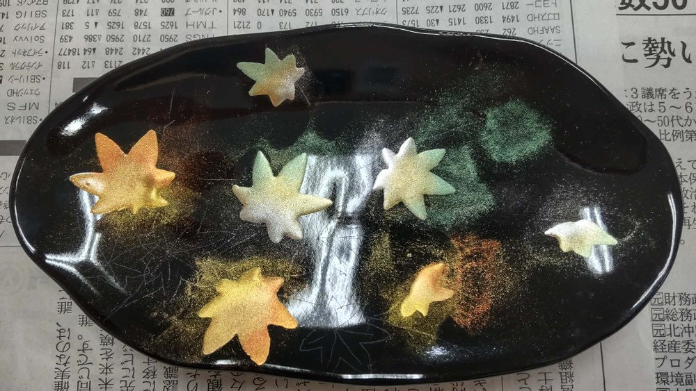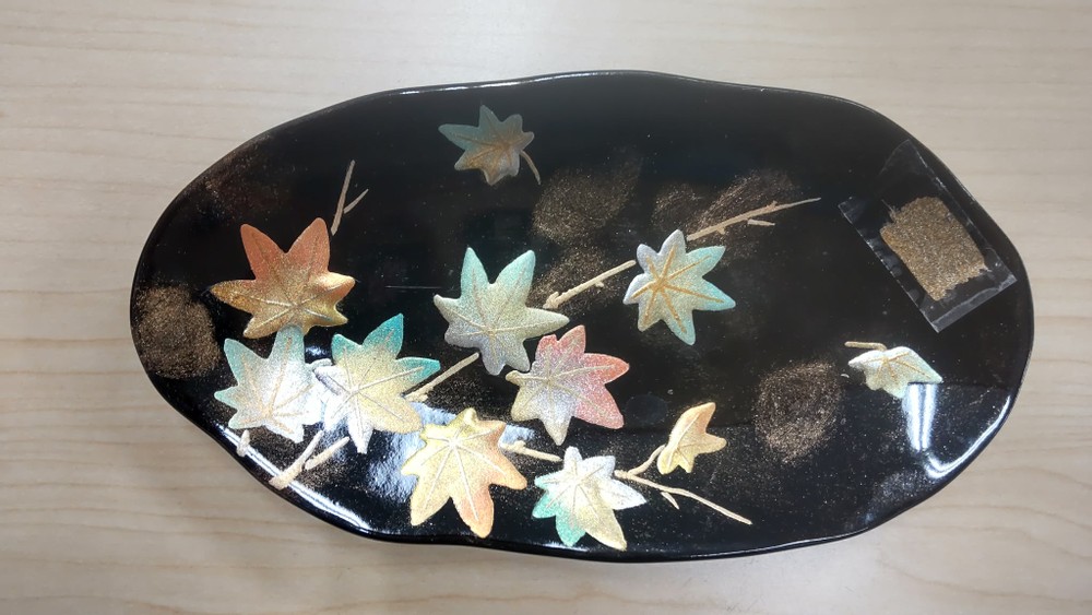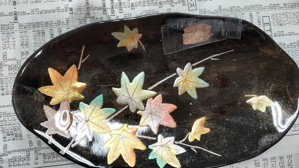 When the lacquer becomes half-dry, I put different colored fake gold powder with a brush to create maple leaves. After the leaves drys, I draw veins with lacquer. When the veins become half-dry, I put gold powder again. I repeat this process.