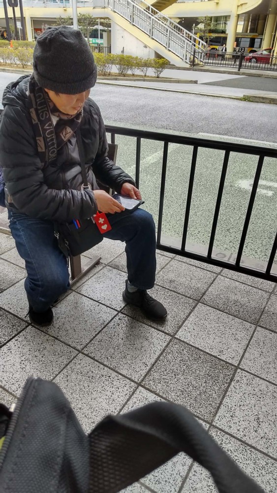 At that moment, a person sitting in a bench dashed toward me and moved the bags on the ground. I didn't say anything, but I didn't like it. In front of me was an elderly woman who looked older than the guy, but she was standing in the line. I thought he should have given her his seat, then she could sit on the bench instead