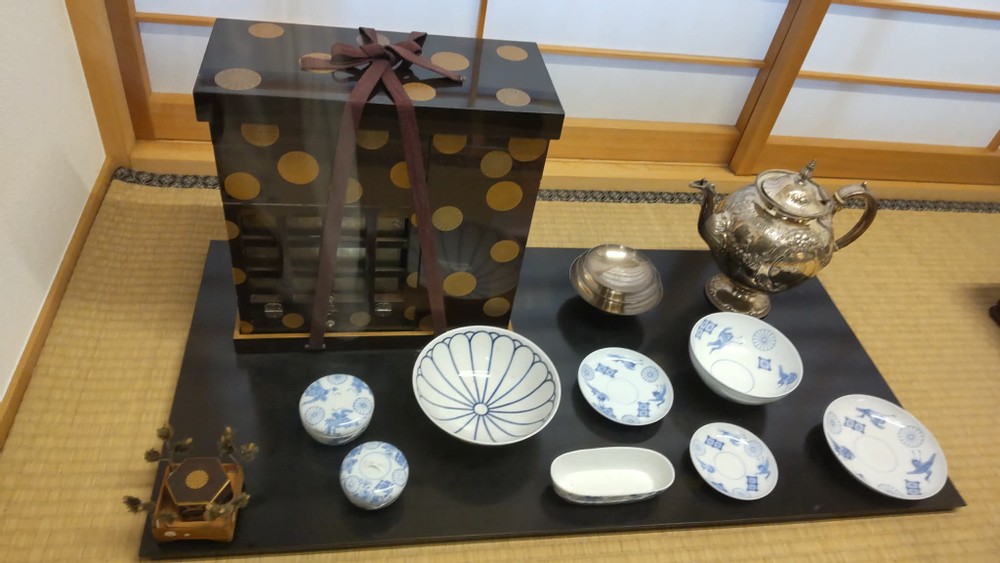 The very left in the second row in the picture below shows a sake bottle and a sake pot. The items next to them are all bento boxes. In the first row, you can see some portable silverware.