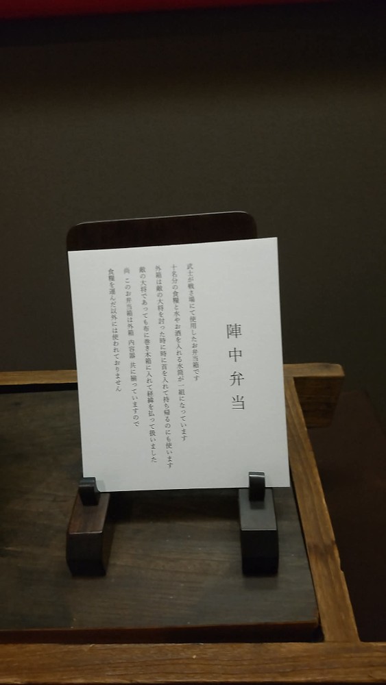 The picture below shows bento boxes for samurai warriors. The black container carried food, water, and sake for ten people. It was also used for carrying opponents' heads. When warriors won battles, they would behead the enemy heads to show the evidence to their lords. However, the decorated black box we saw wasn't used for that purpose.