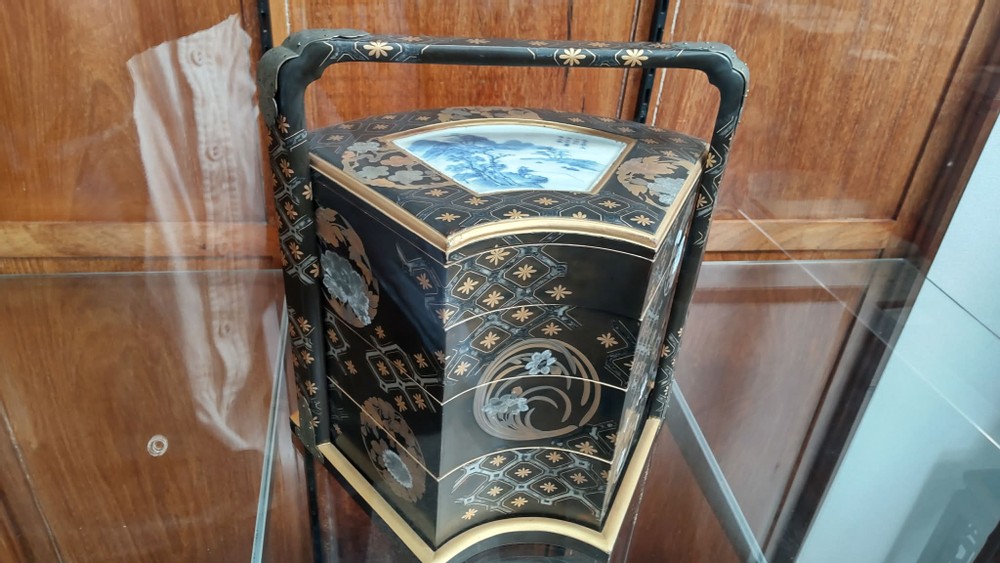 The box in the center decorated with seashells (raden) also a bento box. What's a beautiful one! The jar next to it is also a bento box.