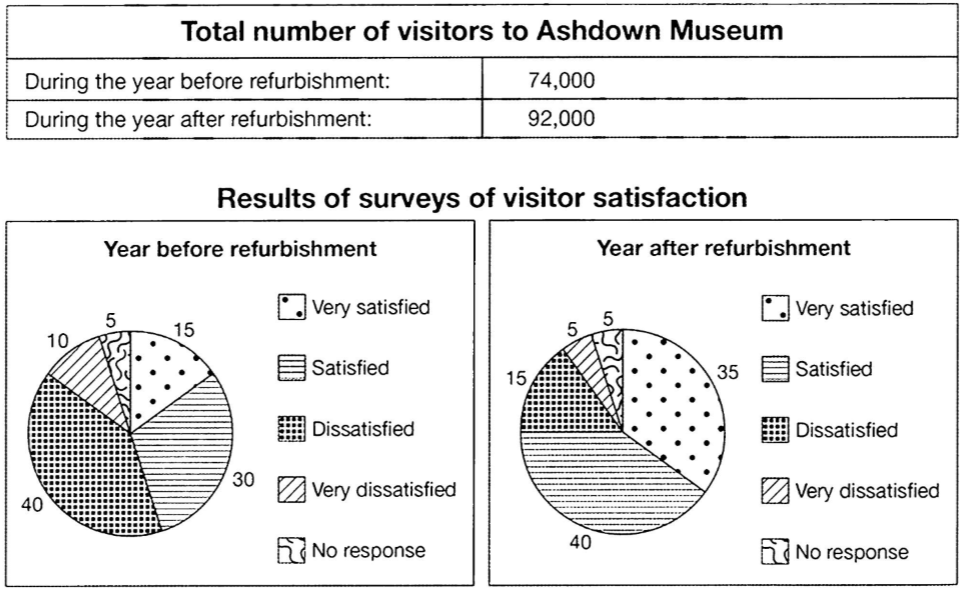 The table illustrates how many visitors come to Museum over the periodS dividing which indicates the time doing refurbishment or not. The charts give information about how visitors satisfaction level changes taking account of refurbishment.